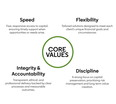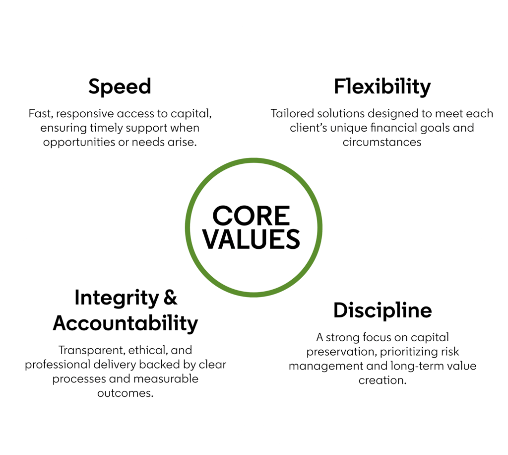 To deliver efficient, transparent, and disciplined financial services that bridge funding gaps, enable business growth, promote financial responsibility, and create sustainable value for our clients and communities.